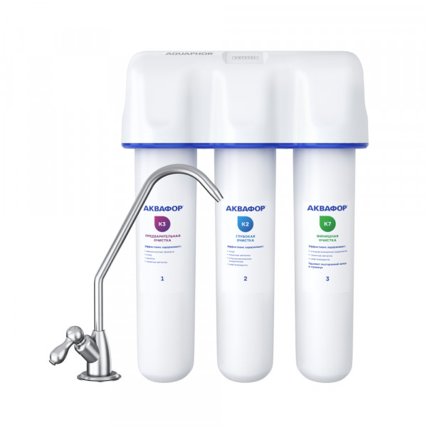 Обратноосмотические фильтры используются для абсолютной защиты от накипи, т.к. полностью устраняют соли жесткости из воды.нетЧисло ступеней очисткиКартриджи последовательно очищают воду и от видимых примесей, и от растворенных. Первый картридж задерживает более крупные частицы, а каждый последующий - более мелкие. Чем больше ступеней - тем лучше фильтр очистит воду: поймает более мелкие видимые частицы ржавчины, песка и ила, успеет захватить из воды максимум растворенных примесей - хлора, нитратов, тяжелых металлов и других.3МинерализацияПроисходит после финишной очистки воды. Необходима прежде всего в фильтре обратного осмоса, поскольку такой фильтр полностью устраняет из воды все примеси, в том числе минералы. Минералы добавляются в оптимальной концентрации - для пользы и привычного вкуса воды.нетПостфильтрацияФинальный этап очистки воды: картриджи постфильтрации удаляют самые мелкие механические частицы и кондиционируют воду, придавая ей более приятный вкус.нетНакопительная емкостьОбычно нужна в фильтрах обратного осмоса. Глубокая фильтрация требует времени. Чтобы Вам не приходилось ждать, пока вода наберется в чайник или кастрюлю, почти во всех моделях используется накопительный бак для чистой воды или другая емкость. В стандартном фильтре обратного осмоса под мойку воды в баке достаточно для семьи из 5-6 человек.нетФильтрующий модуль в комплектедаОтдельный крандаДавление в водопроводе не более, атмМаксимальное давление воды на входе в систему, при котором возможна стабильная работа фильтра.6,5Ширина, смОбратите внимание на габариты фильтра, и измерьте, сколько свободного пространства в предполагаемом месте установки.26,0Глубина, смОбратите внимание на габариты фильтра, и измерьте, сколько свободного пространства в предполагаемом месте установки.9,0Защита корпуса от гидроударовдаИсходная водаЖесткая вода – вода с избытком минеральных солей. От нее появляется накипь в чайнике, известковый налет на сантехнике и разводы на посуде. Мягкая вода – та, в которой мало минеральных солей. Нет накипи в чайнике и разводов на посуде. Фильтры для мутной воды и фильтры от ржавчины, как правило, имеют несколько стадий очистки и дополнительный полипропиленовый картридж. Он задерживает механические частицы ила, песка и ржавчины и защищает картриджи более глубокой очистки.мягкаяУстраняет мутностьМутность водопроводной воды может говорить о том, что в ней много мелких механических частиц. Важно, чтобы в фильтре был установлен дополнительные картридж механической предфильтрации (полипропиленовый) - он продлит жизнь остальным картриджам более тонкой очистки.нетУстраняет ржавчину, бурый осадокЛюбой фильтр под мойку удалит из воды крупные и мелкие частицы ржавчины. Некоторые фильтры имеют повышенный ресурс по железу: они дольше служат в такой воде, поскольку лучше подходят для удаления из воды железа и механических частиц ржавчины.нетЗащита от бактерийВсе проточные фильтры в той или иной степени защищают от бактерий. Например, добавление серебра препятствует их размножению. Это стандартная степень защиты. Если в семье есть дети, пожилые люди или аллергики, воду рекомендуется обеззараживать, то есть полностью удалять микроорганизмы. Повышенную защиту от бактерий дают фильтры с половолоконной мембраной. Это пучок тру
