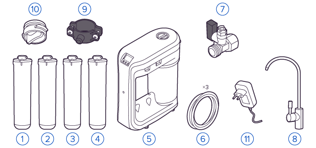 Картриджи последовательно очищают воду и от видимых примесей, и от растворенных. Первый картридж задерживает более крупные частицы, а каждый последующий - более мелкие. Чем больше ступеней - тем лучше фильтр очистит воду: поймает более мелкие видимые частицы ржавчины, песка и ила, успеет захватить из воды максимум растворенных примесей - хлора, нитратов, тяжелых металлов и других.